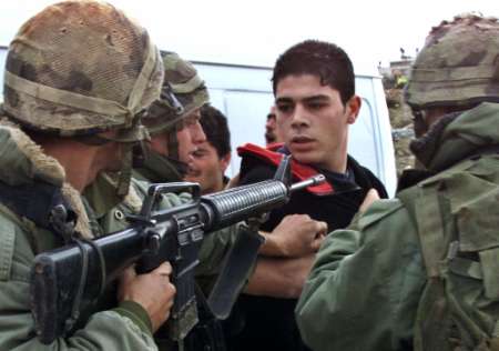 当地时间12月9日,以色列海法市一公共汽车站再次发生爆炸事件,至少造成8人受伤。连续的自杀性爆炸使得以巴局势日趋紧张。图为12月8日一名以军士兵在拉马拉和耶路撒冷之间的检查站用枪指着一名巴勒斯坦男子。